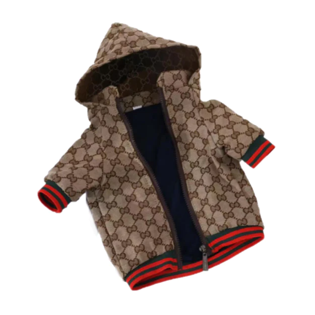 The Pucci Monogram Brown and Tan Winter Dog Jacket keep your furry friend warm and look great at the same time. This winter dog jacket is made from high-quality material. It is soft, comfortable, and dirt-resistant. The jacket has a hood and is designed with a classic brown and tan monogram pattern. You can easily take on and off this winter dog jacket. It comes with a zipper located on the stomach, and the jacket is suitable for small to medium-sized dogs. The Pucci jacket keeps your dogs warm in cold weather and has worry-free activities.